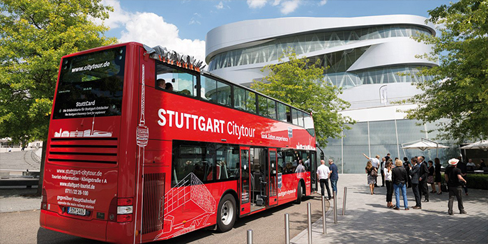 Bitte Platz nehmen! Die roten Cabrio-Doppeldecker-Busse der Marke Mercedes-Benz laden in der Geburtsstadt des Automobils zu einer Stadtrundfahrt der besonderen Art ein. Im Hop on Hop off-Prinzip können Besucher*innen die Stadt individuell erkunden und an insgesamt neun attraktiven Haltepunkten ein- und wieder aussteigen. Die Tour führt vorbei am Schlossplatz, dem Mercedes-Benz Museum und den Weinbergen.